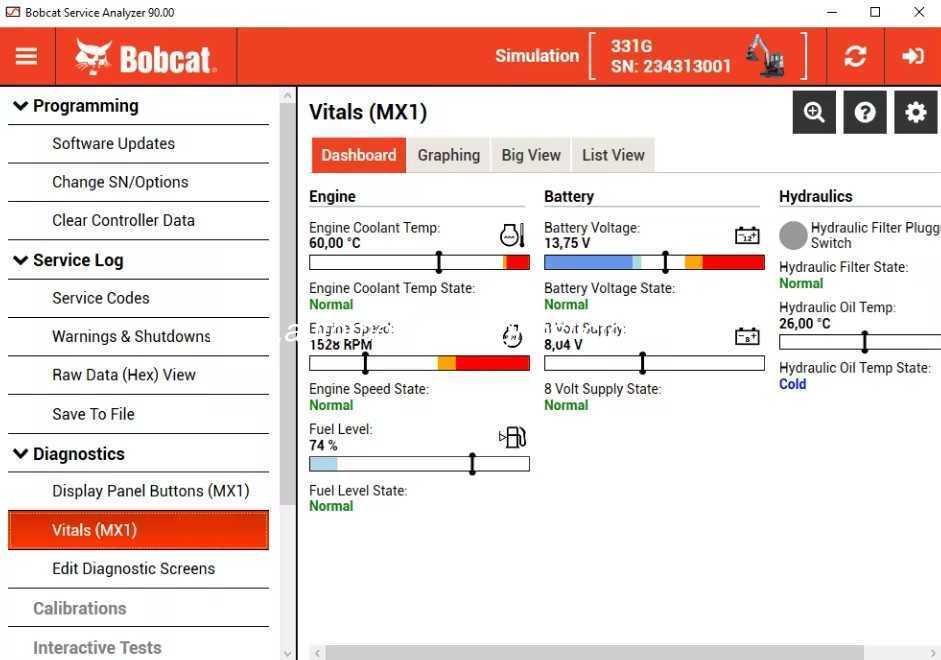 Ferramentas de diagnóstico Bobcat destina-se à programação, diagnóstico, registro de serviço e calibração: – Atualizações de software – Alterar SN/Opções – Limpar dados do controlador. – Status de calibração da bomba de acionamento – Painel – Controle Remoto - Sistema – Sinais vitais, – Editar telas de diagnóstico – Testes interativos e etc.